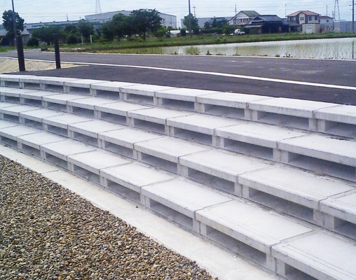 ため池で用いられる張り(階段)ブロックの基礎・天端コンクリートをプレキャスト化した製品
